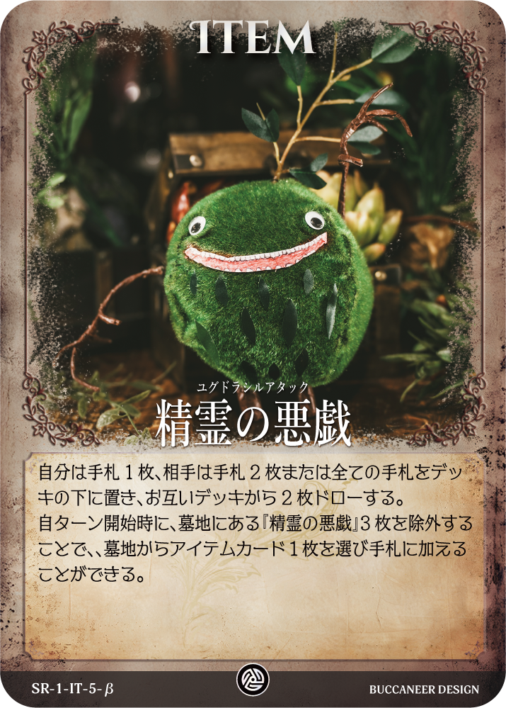 自ターン開始時に、墓地にある『精霊の悪戯』3枚を除外することで、、墓地からアイテムカード1枚を選び手札に加えることができる。