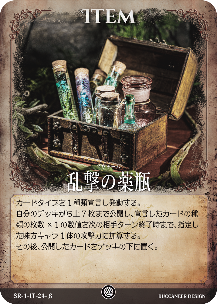 自分のデッキから上7枚まで公開し、宣言したカードの種類の枚数×1の数値を次の相手ターン終了時まで、指定した味方キャラ1体の攻撃力に加算する。