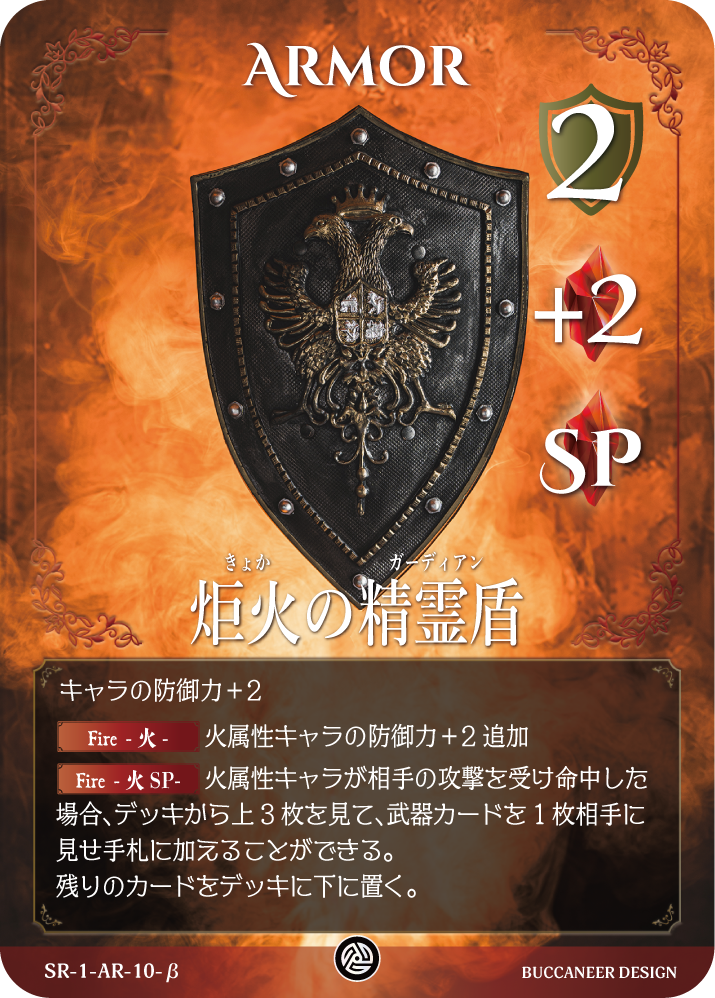 火属性キャラが相手の攻撃を受け命中した場合、デッキから上3枚を見て、武器カードを1枚相手に見せ手札に加えることができる。